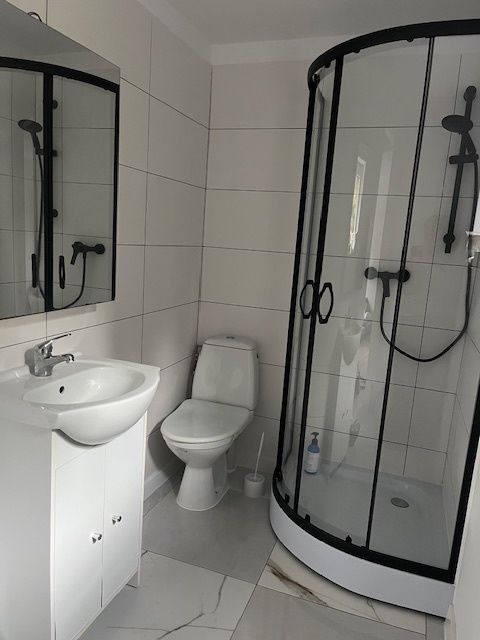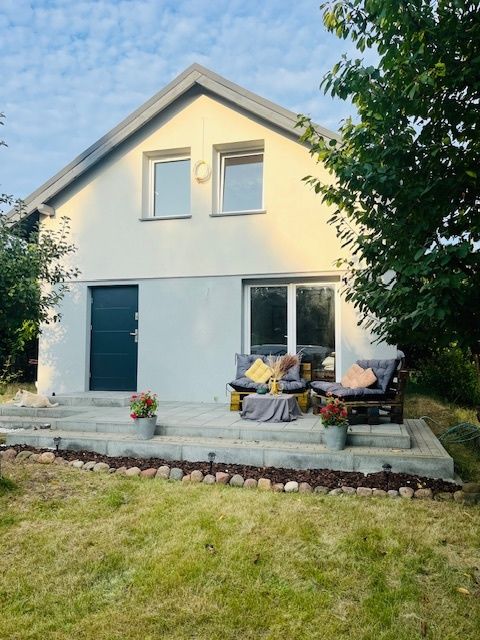 Na parterze duży pokój dzienny połączony z aneksem kuchennym- wyposażonym w szafki, zlew, pochłaniacz) z wyjściem na duży taras; łazienka cała w płytkach, z kabiną prysznicową , toaletą, umywalką na szafce i dużym lustrem, ciepła woda z elektrycznego podgrzewacza. Na piętrze są cztery pokoje - przy czym jeden można przerobić na łazienkę ponieważ są doprowadzone przyłącza wody. Do domku doprowadzona instalacja elektryczna, zimna woda oraz instalacja kanalizacyjna z szambem. Dom wstanie deweloperskim, nowy dach - blachodachówka. Wszystkie okna nowe pcv, na podłogach panele, nowe drzwi. Na działce znajdują się ozdobne nasadzenia. Ogród w całości ogrodzony. Możliwość umieszczenia skrzynki na listy i otrzymywanie korespondencji.