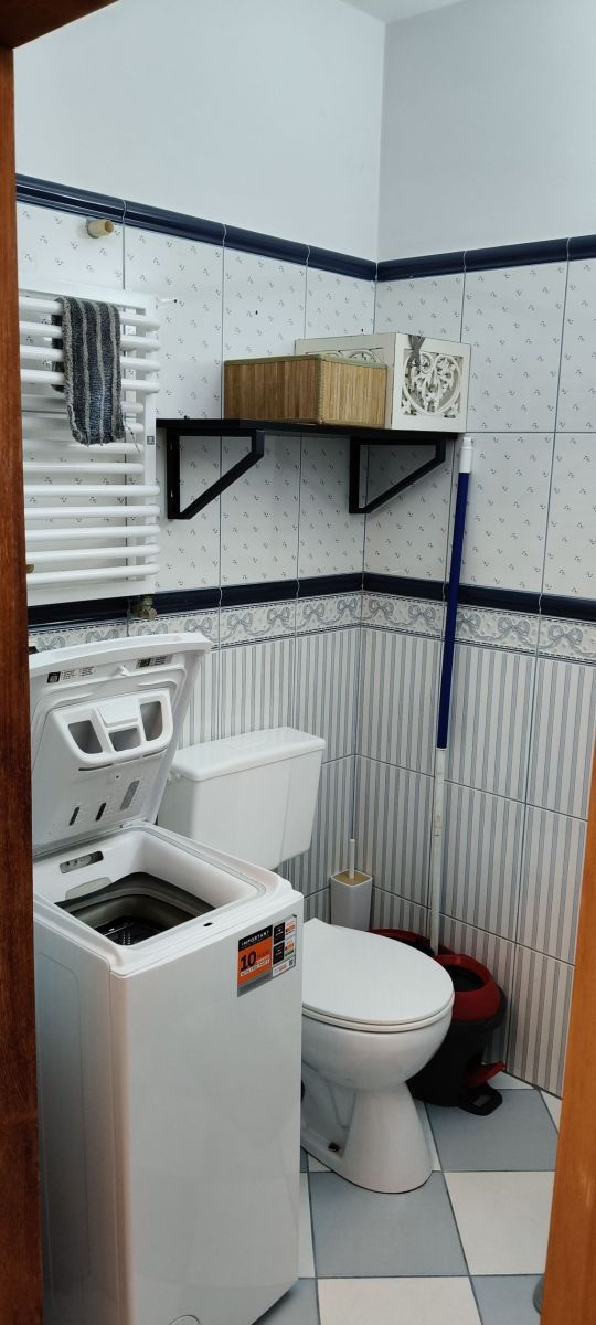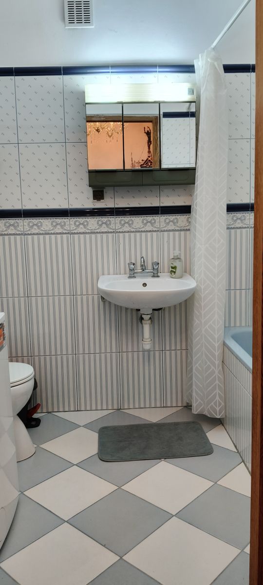 W łazience z wanną, umywalką z lustrem, ubikacją i szafką, znajduje się również pralka. Całość utrzymana w eleganckich, nowoczesnych płytkach.