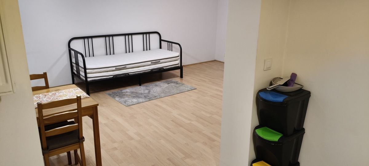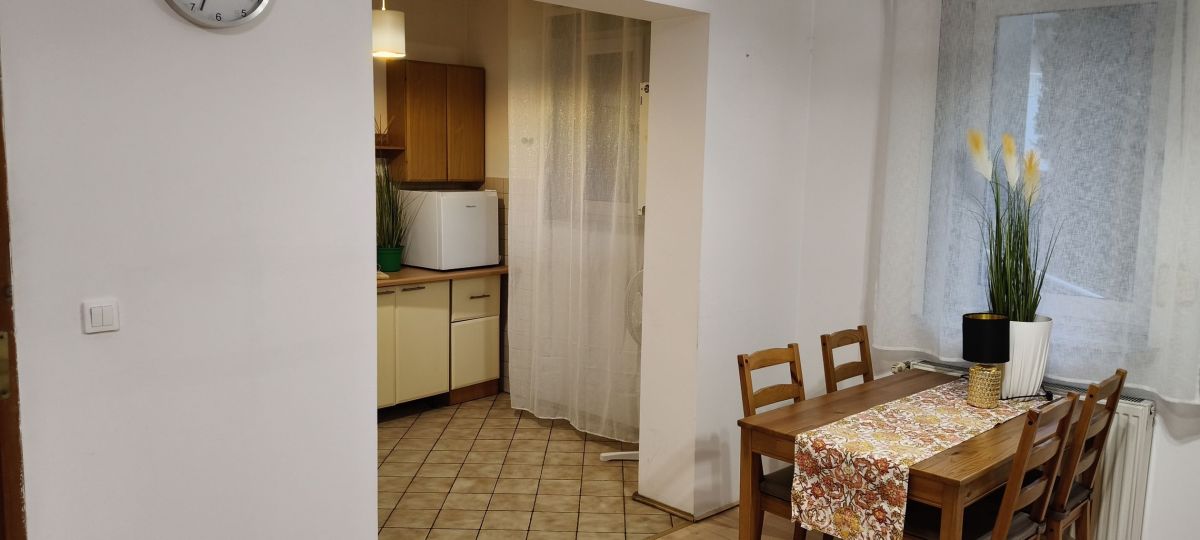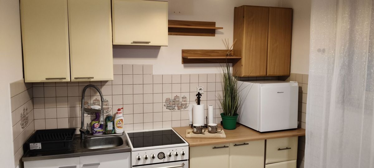 Pokój jest wyposażony w rozkładane łóżko, pojemną szafę, stół oraz cztery krzesła - wszystko, co potrzebne do codziennego komfortu. Kuchnia połączona z pokojem, w pełni wyposażona: nowa lodówka, kuchenka z piekarnikiem, a duże okno zapewnia doskonałe doświetlenie przestrzeni.