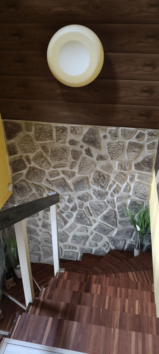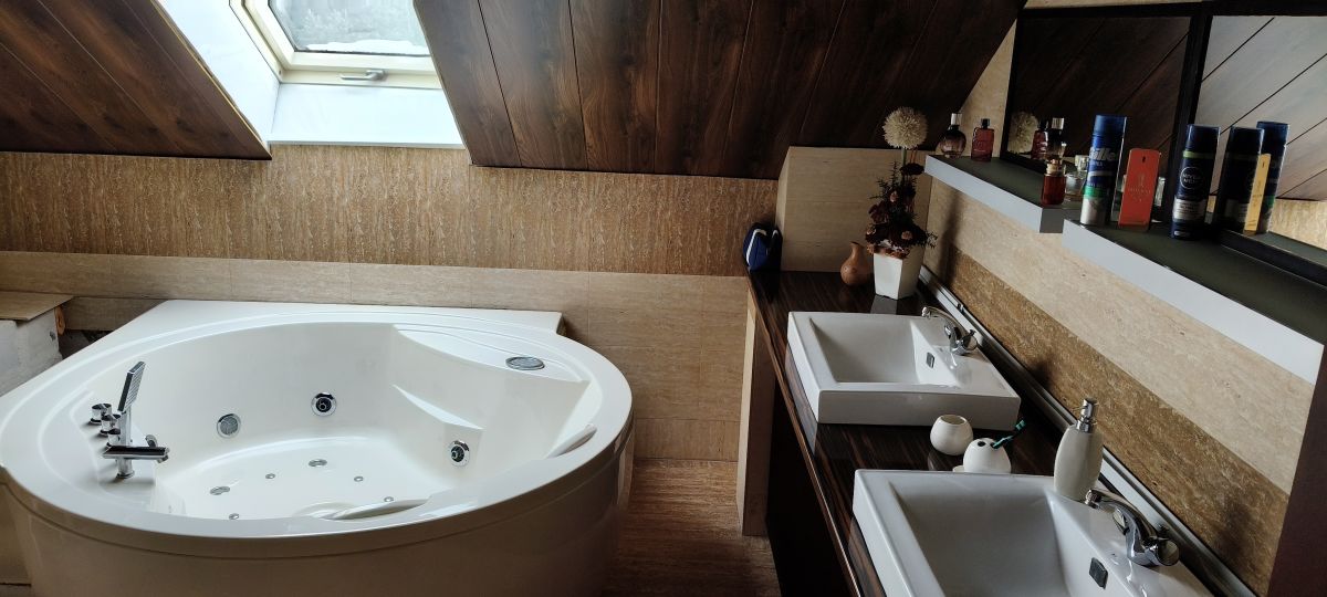 Na parterze znajduje się kuchnia z jadalnią (~20 m²), pokój z kominkiem (~30 m²), łazienka z kabiną (~2 m²) oraz pokój o powierzchni 6,5 m². Na piętrze czekają na Ciebie trzy duże pokoje (16 m², 12 m² i 11 m²), korytarz, garderoba (2 m²) oraz łazienka z oknem o powierzchni 10 m². Okna PCV, na podłogach płytki i panele, a schody betonowe wyłożone drewnem egzotycznym zapewniają trwałość i estetykę.