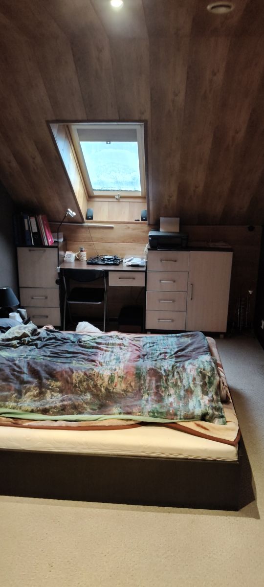 Nad piętrem znajduje się pomieszczenie strychowe, dostępne chowanymi schodami drabinowymi. Ogrzewanie centralne z pieca gazowego umieszczonego w piwnicy gwarantuje komfort przez cały rok. Budynek zewnętrznie otynkowany i ocieplony, co zapewnia doskonałą izolację.